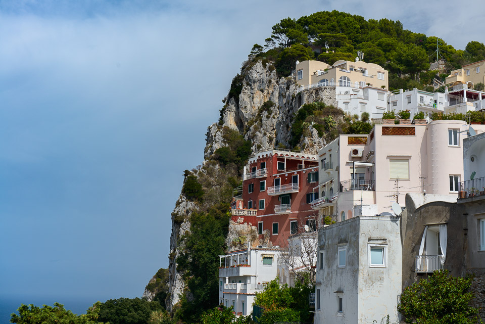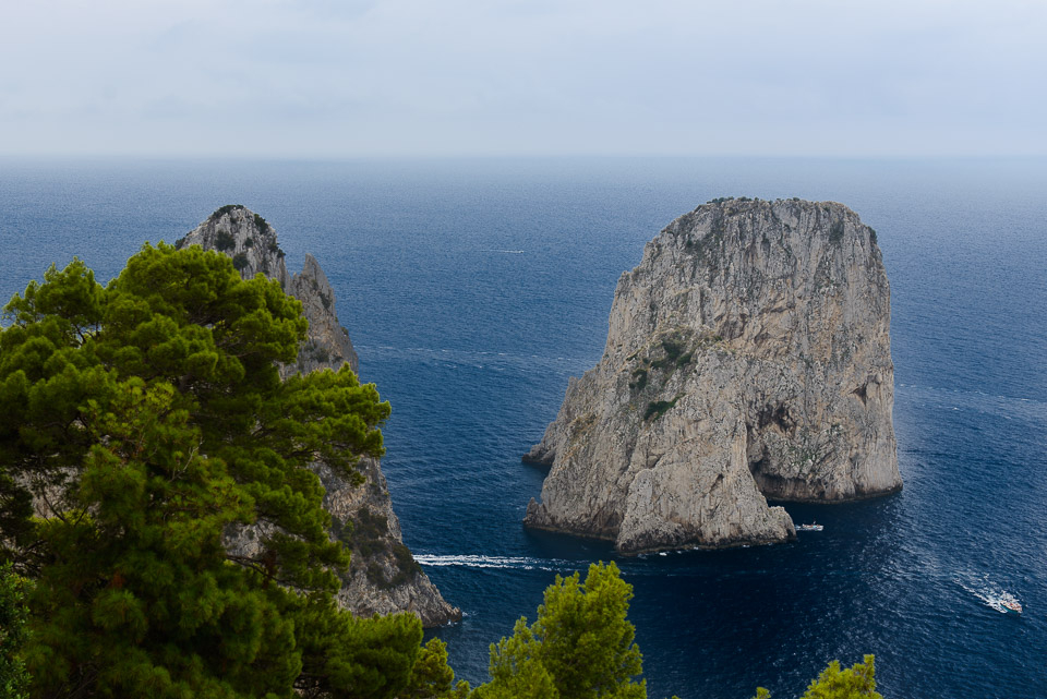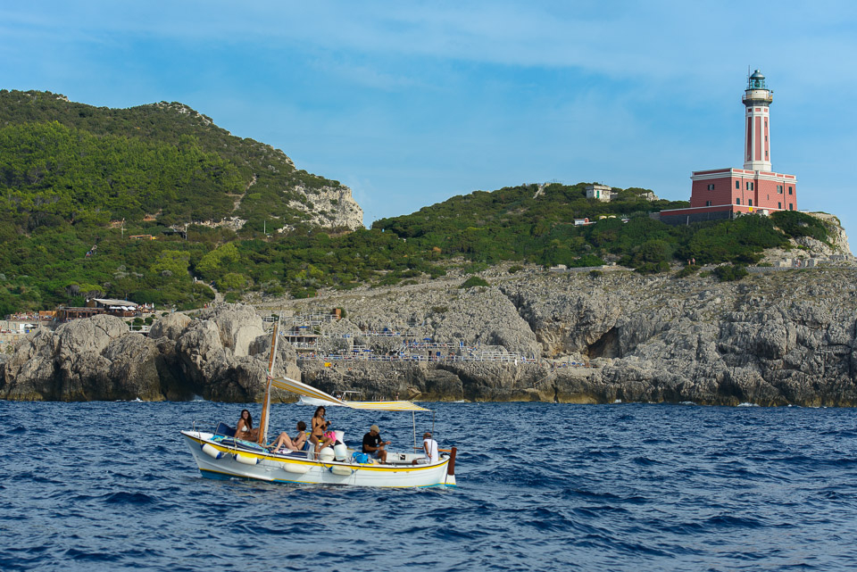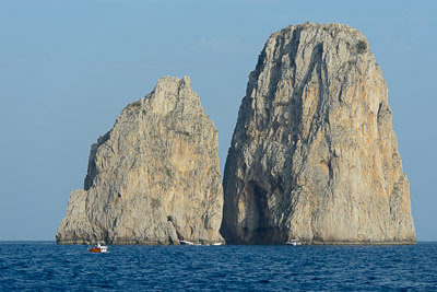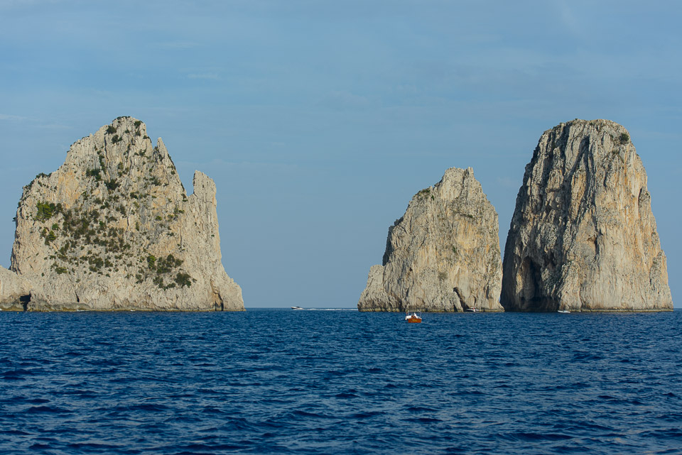 Accanto alla passeggiata di Via Krupp, a pochi minuti dalla Piazzetta di Capri, i Giardini di Augusto propongono una serie di terrazze fiorite affacciate su Marina Piccola e sui Faraglioni. È il luogo classico per scattare una foto panoramica. Via Krupp, che scende sinuosa a disegnare una sequenza di tornanti tagliati nella nuda roccia, è considerata da molti una delle strade pedonali più spettacolari al mondo. I Faraglioni sono il simbolo dell’isola azzurra: tre formazioni rocciose a forma di picco alte circa cento metri e spruzzate dal blu del mare. C’è il Faraglione di Terra (o Saetta), l’unico ancora unito alla terraferma nonché il più alto dei tre (109 metri); il Faraglione di Mezzo (o Stella), bucato al centro da una cavità; il Faraglione di Fuori (o Scopolo), habitat della Podarcis sicula coerulea, nota anche come “lucertola azzurra”. Del complesso roccioso fa parte anche un quarto faraglione, lo scoglio del Monacone, fino al secolo scorso frequentato dalla foca monaca. La  Grotta Azzurra