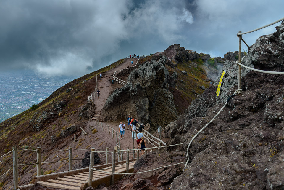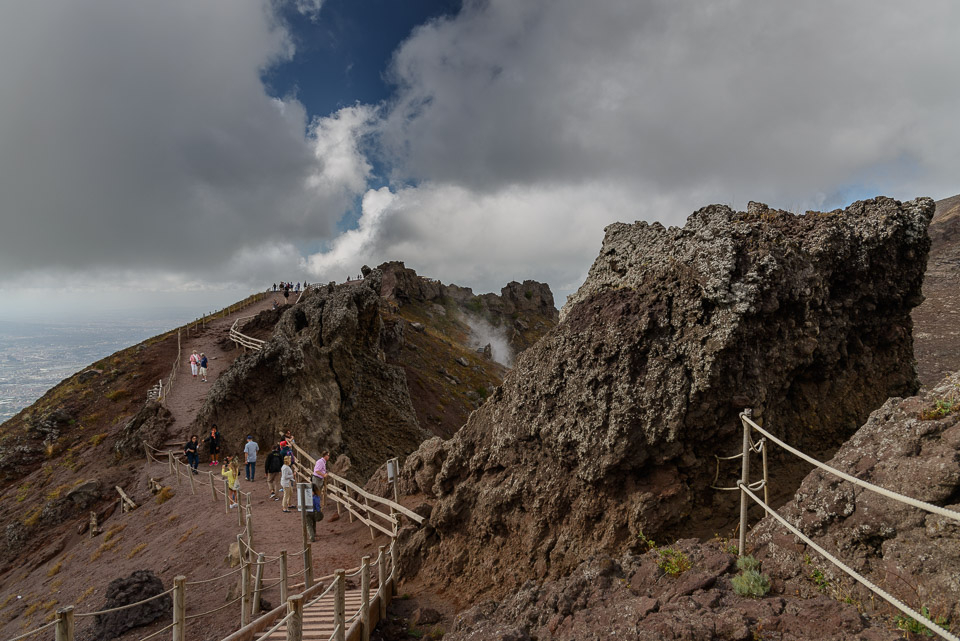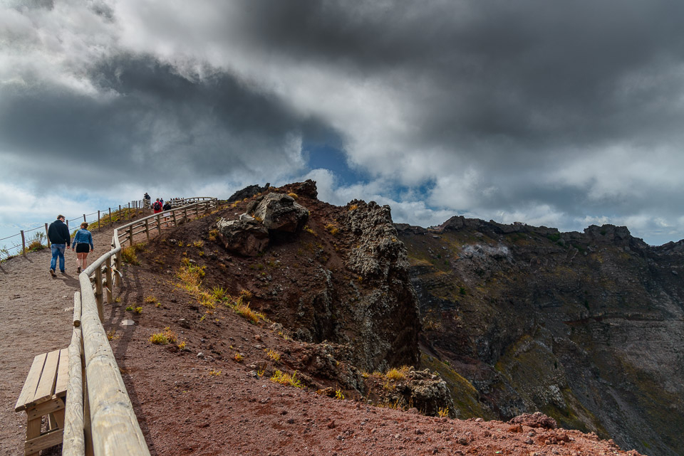 Qui, dopo aver ammirato durante la salita il suggestivo panorama del vecchio cratere del Somma, la colata lavica del 1944, la neoformazione del Colle Umberto ed ovviamente la città di Napoli, inizia la veduta sull’interno del cratere, con la vigilanza delle guide vulcanologiche. Giunti però al primo “terrazzo” sul cratere, si scorge la parte più alta del vulcano, da dove si gode di un panorama a 360° sull’ intero complesso vulcanico del Somma/Vesuvio e sulla Piana Campana fino all’ appennino molisano-abbruzzese per quanto riguarda i versanti nord ed est; mentre a sud ed ovest si spazia dalle isole di Ischia e Capri, fino alla veduta d’ insieme degli scavi di Ercolano e Pompei.